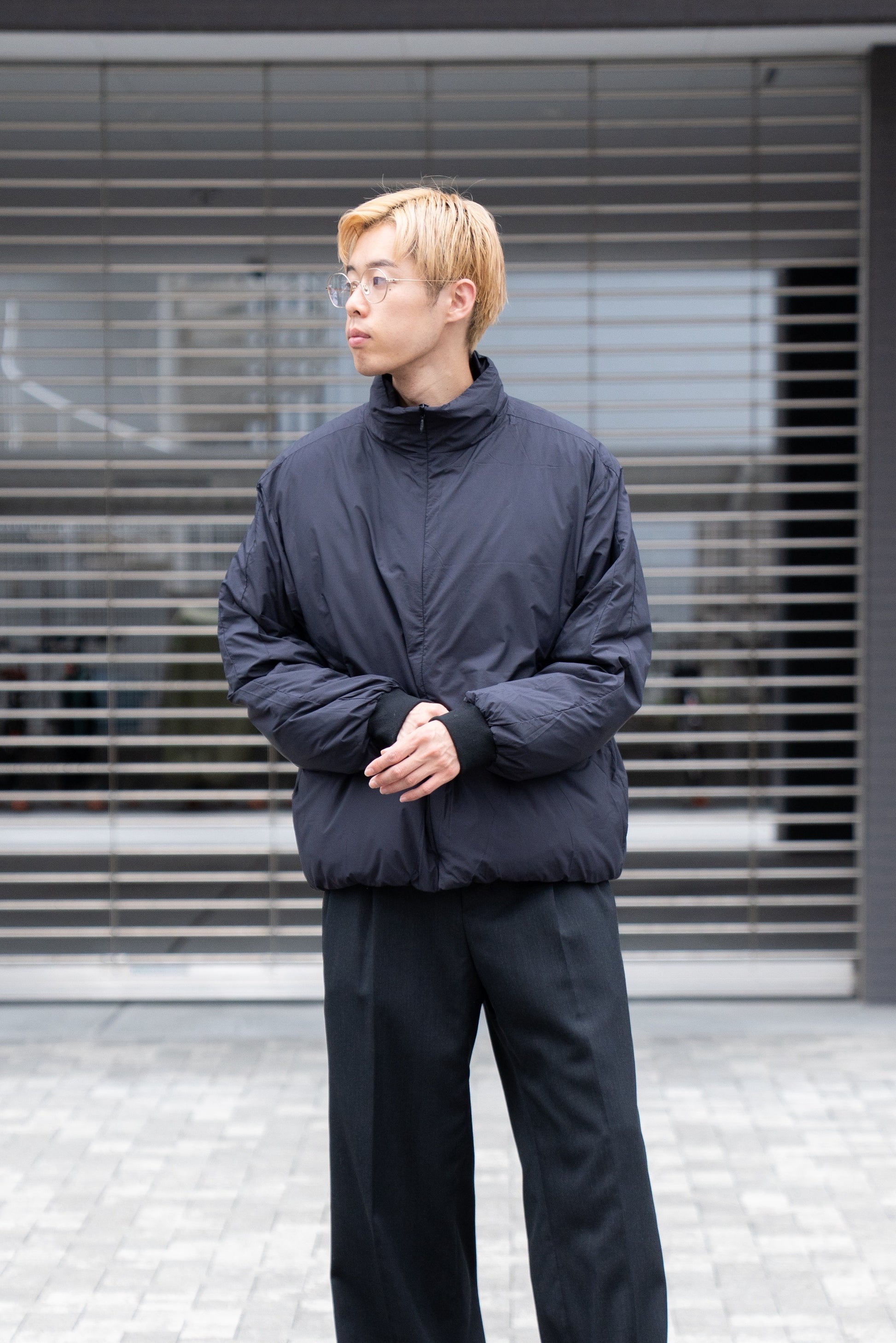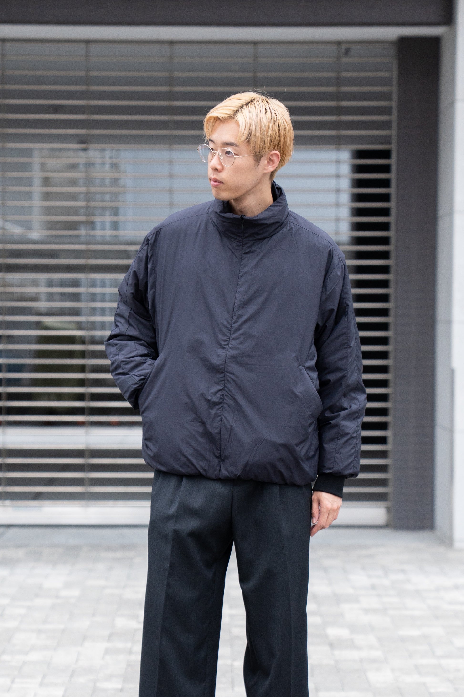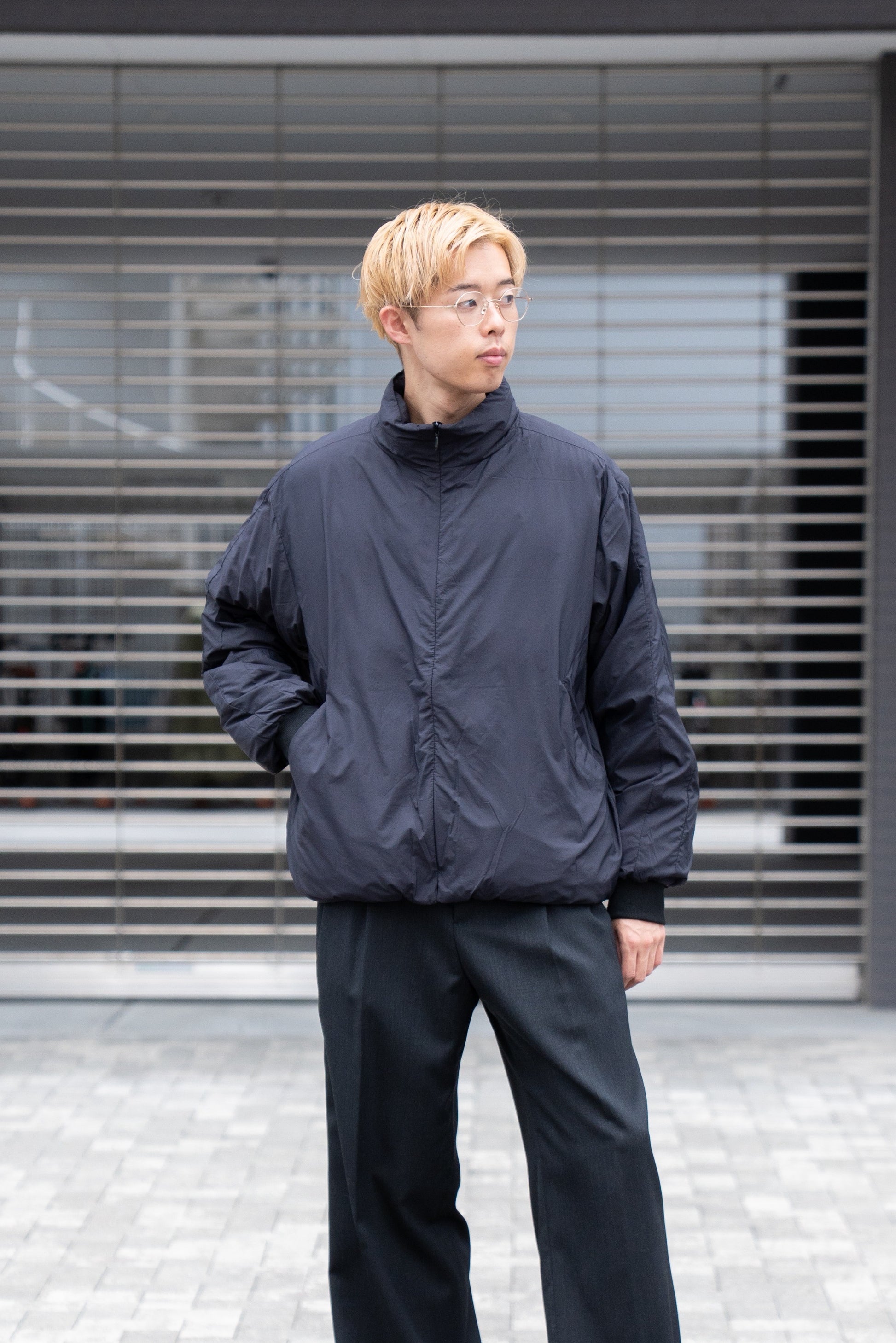 フロントをステッチが見えないコンシールファスナーにすることで、ミニマルな印象に仕上げたダウン入りのトラックジャケット。