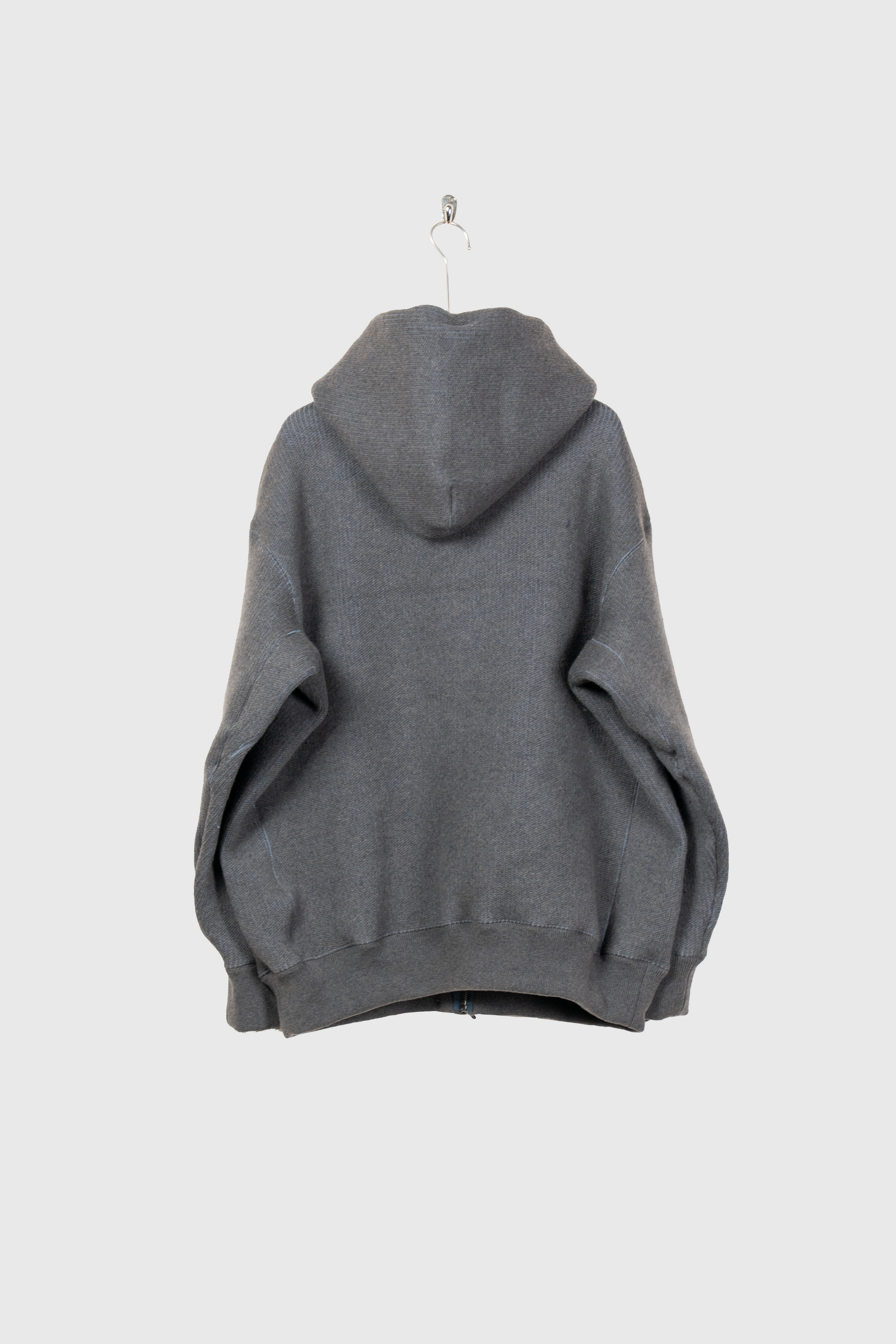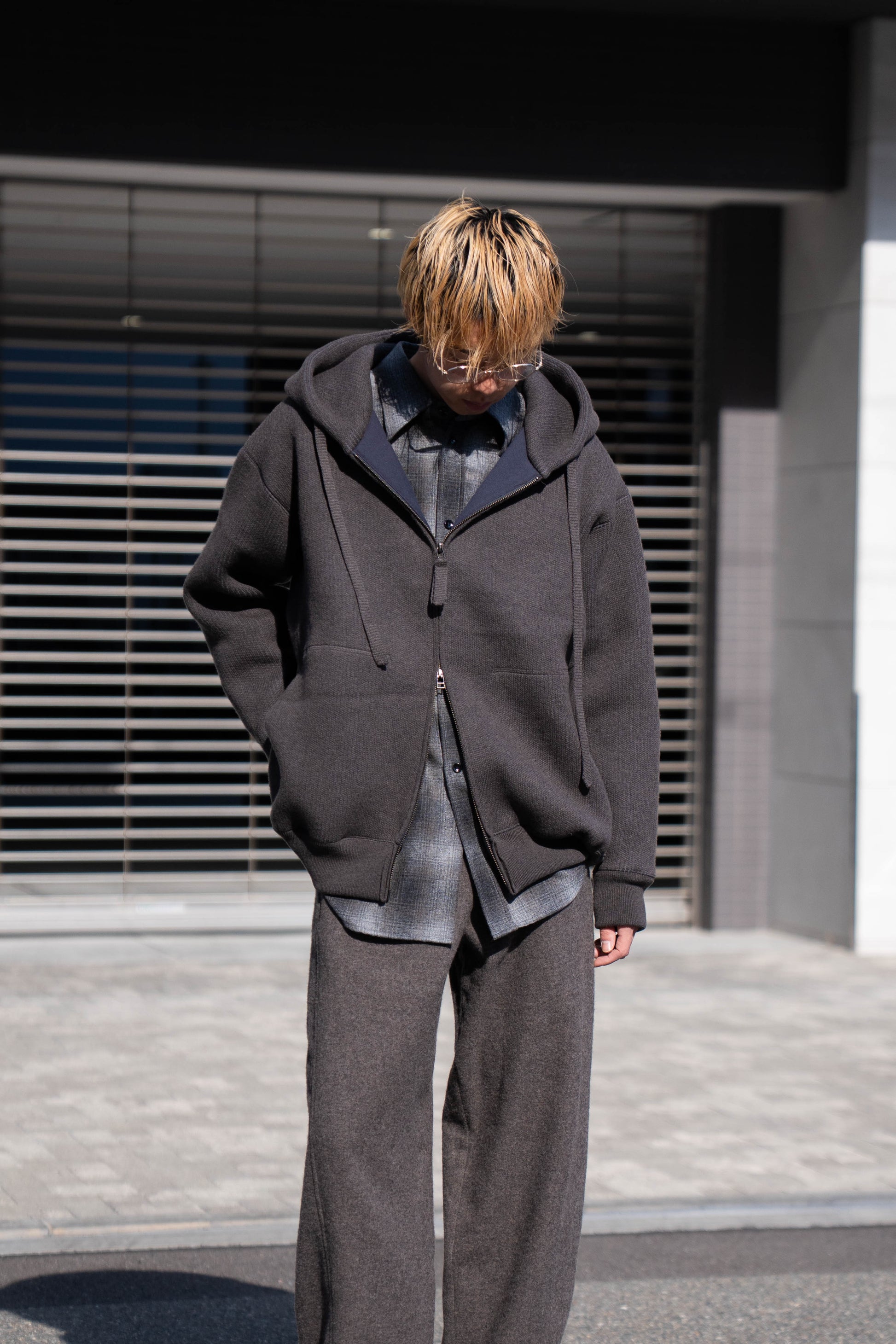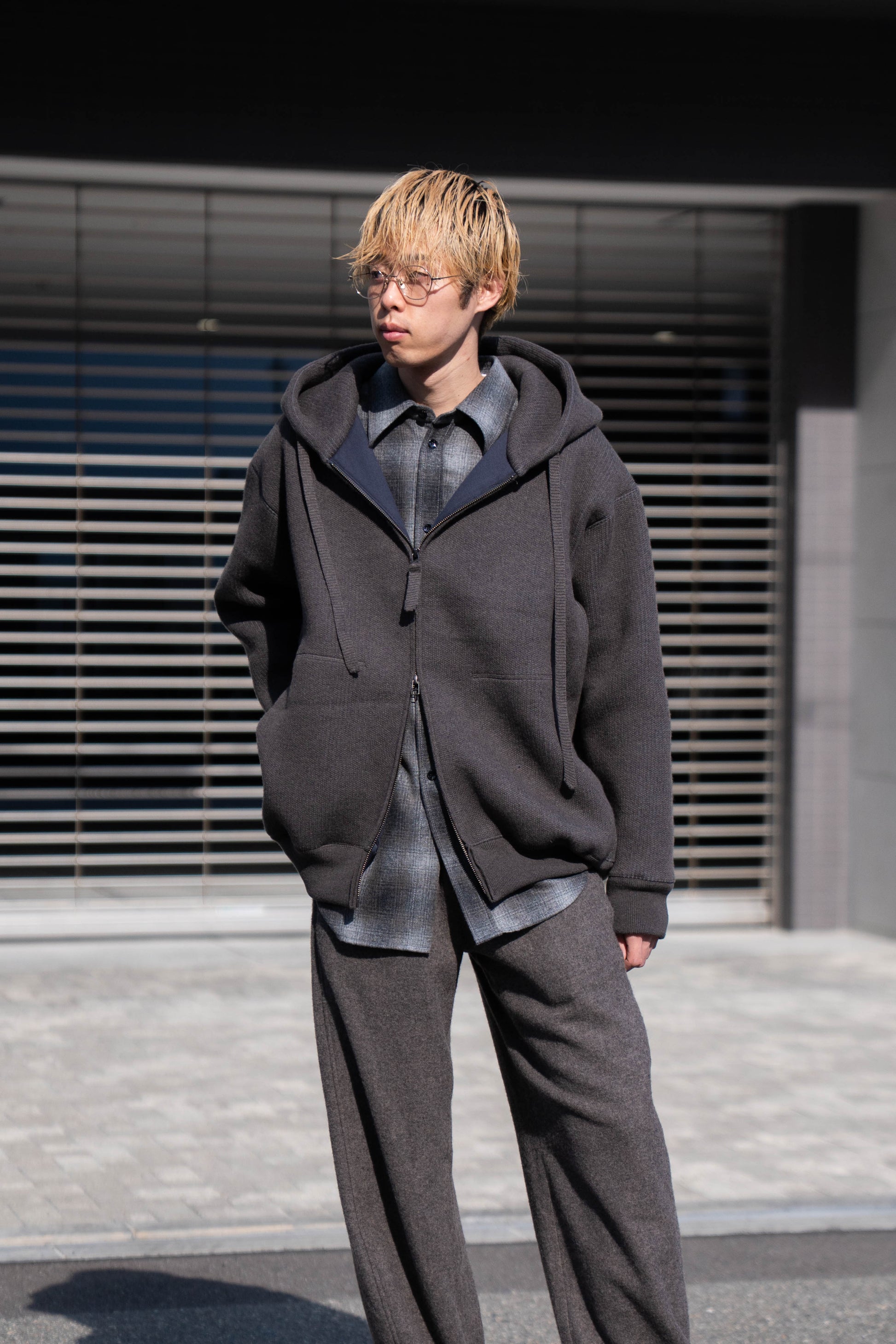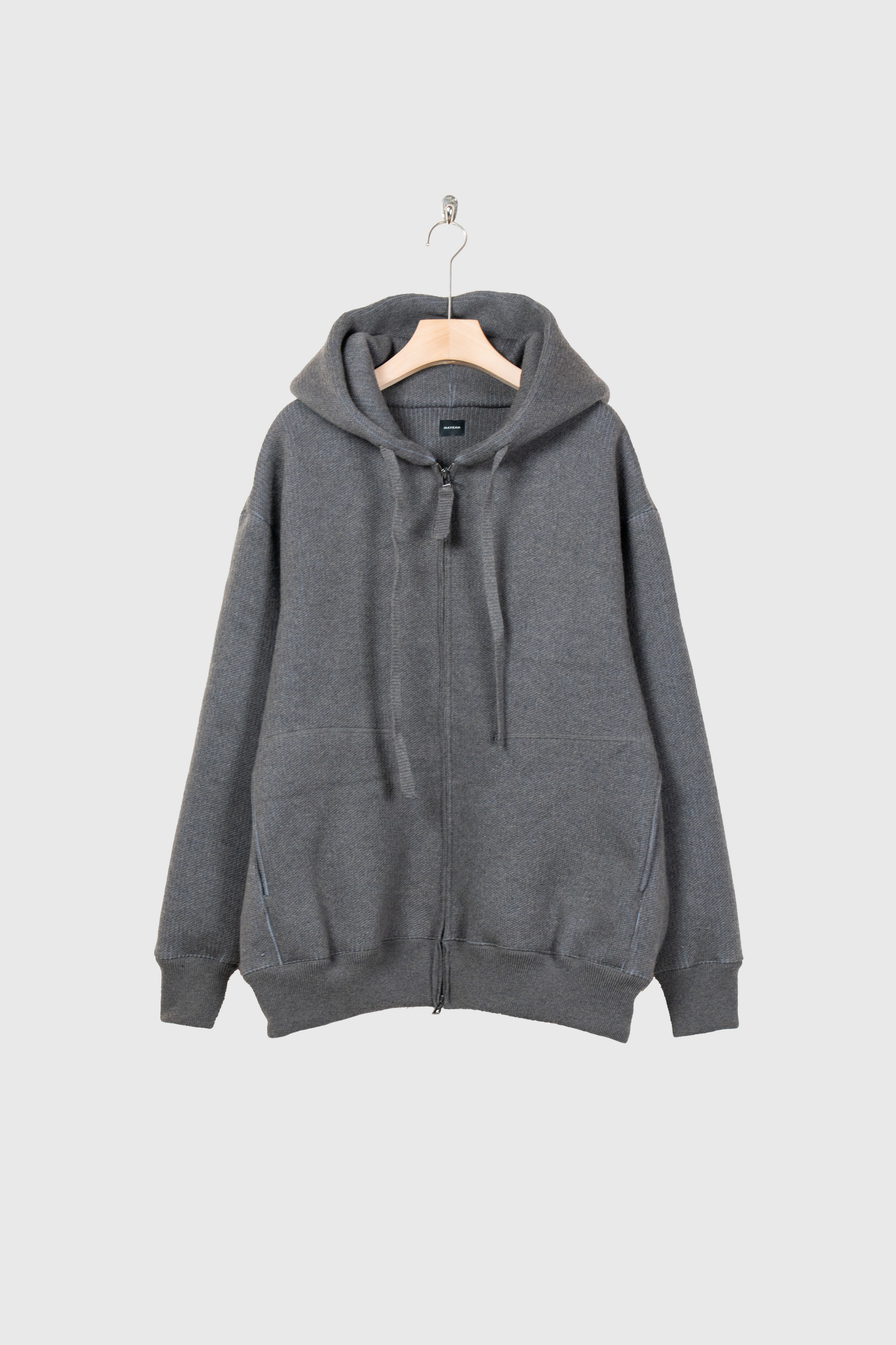 繊細で軽く柔らかい保温性、保湿性に優れたエクストラファインウールとポリエステルで編み⽴て張りと中綿が⼊っているようなボリュームがありながら軽い編み地のジップフード。