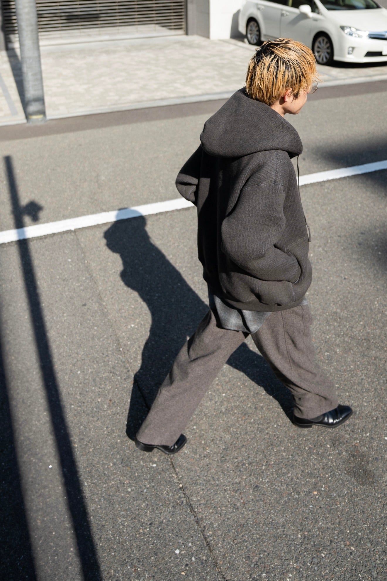 脇にスラッシュポケット、フードは2重でボリュームのあるシルエット。